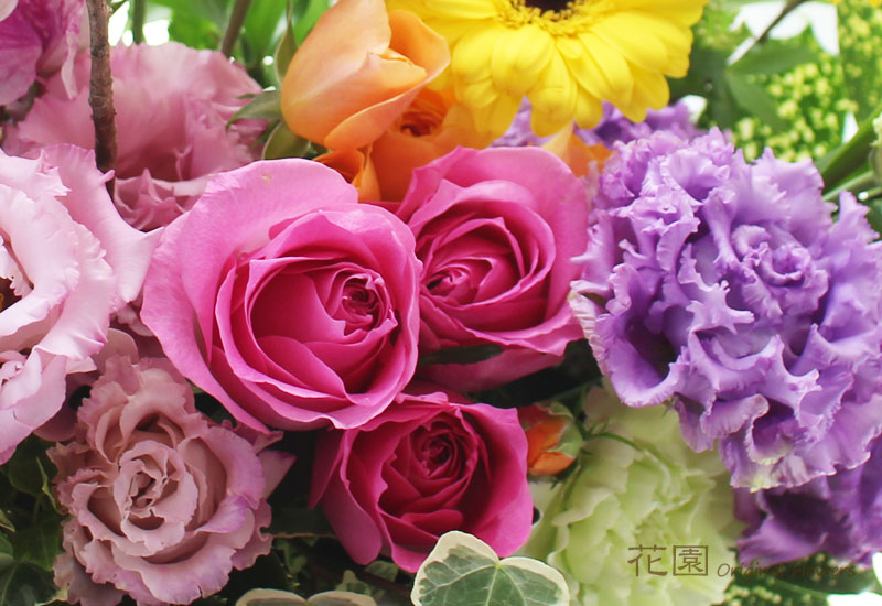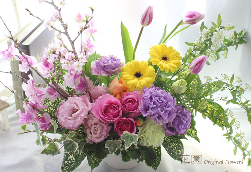 桜やチューリップ、ガーベラなど春の花でまとめたアレンジメント。